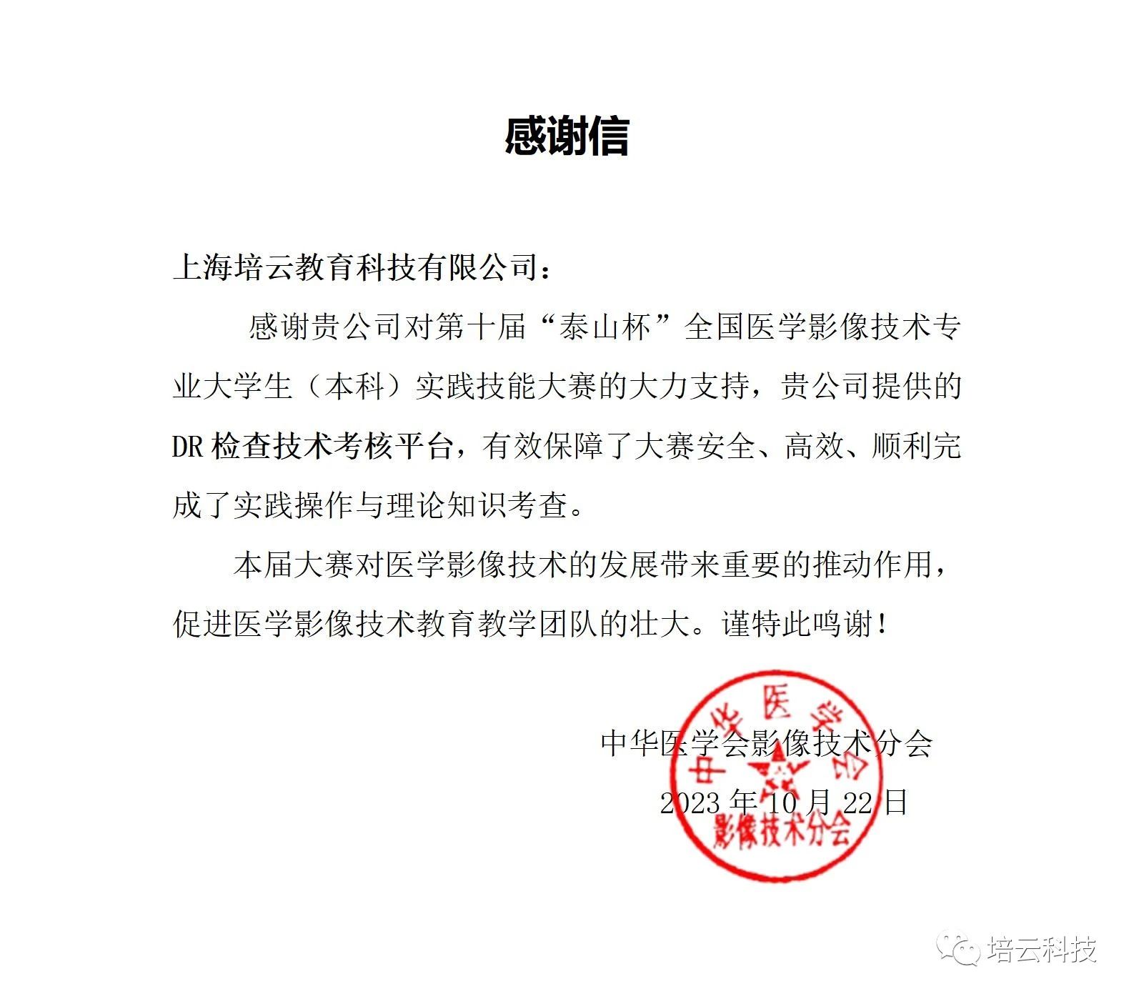 2023年10月19日—22日,全国医学影像技术专业教育教学研讨会、第十届“泰山杯”全国医学影像技术专业大学生(本科)实践技能大赛、第六届全国医学影像技术专业青年教师教学创新大赛、暨中华医学会影像技术分会成立30周年大会系列技能竞赛,暨重庆市医学会影像技术分会2023年学术年会于重庆医科大学附属第一医院顺利举行。上海培云教育科技有限公司(简称“培云科技”)在此表达由衷的祝贺。本次盛会由中华医学会和中华医学会技术分会主办,重庆医科大学、重庆市医学会影像技术分会和中华医学会影像技术分会教育与继续教育组承办,人民卫生出版社协办。