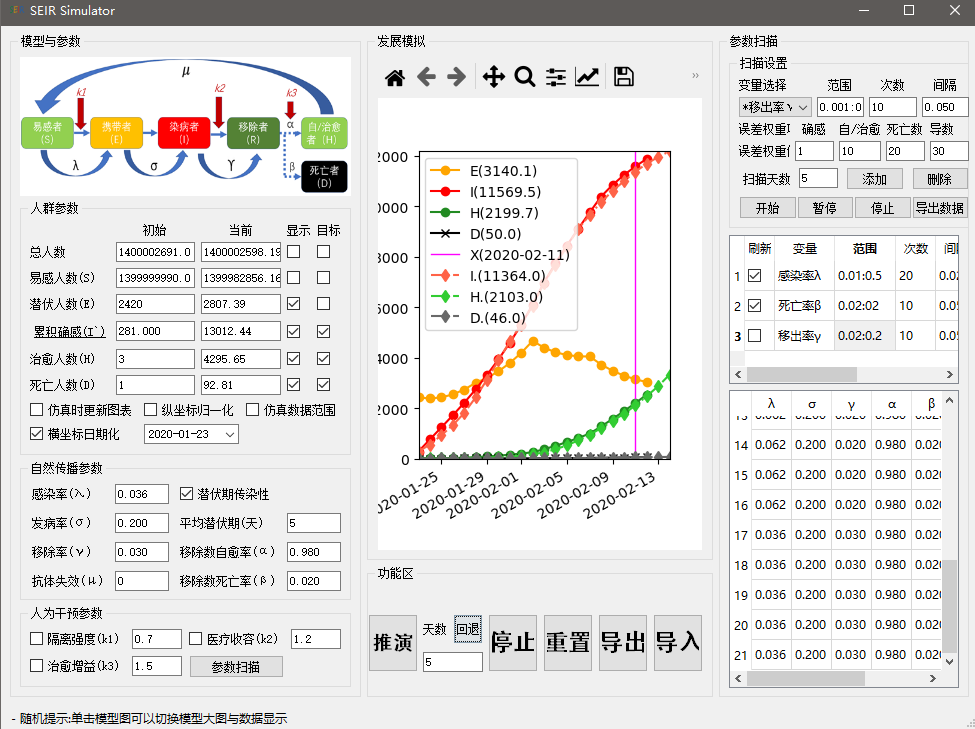 Ø 感染率(λ):每个携带者或染病者日均感染人数;可用R0/平均潜伏天数来设置。根据初期R0=3,平均潜伏天数为3(见潜伏人数设置中),可填入参数1。【该参数可使用扫描功能选定一个最优值】