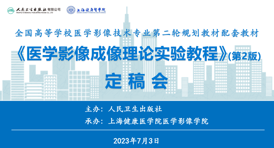 2023年7月3日,由人民卫生出版社主办、上海健康医学院承办的国家卫生健康委员会“十四五”规划教材、全国医学院校医学影像技术专业第二轮教材配套教材《医学影像成像理论实验教程》(第2版)定稿会在上海健康医学院医学影像学院顺利召开。